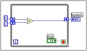 Nếu chúng ta không nối giá trị nào vào initialize terminal của Feedback Node, vòng lặp sẽ hoạt động tương tự như trường hợp Uninitialized Shift Registers. Hãy tạo ra một Block Diagram có chứa vòng lặp như hình dưới đây để kiểm tra việc thực thi của nó. Trường hợp này gọi là “unwired initializer terminal” của Feedback Node.
