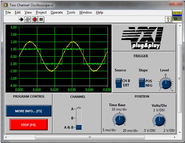 5. Chương trình Mô phỏng hoạt động dao động ký điện tử hay còn gọi là máy hiện sóng (Oscilloscope) 2 kênh. Bạn có thể hiển thị tín hiệu trên cả hai kênh A &B hoặc từng kênh A, B riêng lẻ. Sau khi chọn lựa kênh hiển thị, loại tín hiệu đầu vào, bạn cũng có thể thiết lập về các thông số hoạt động của Oscilloscope, Volts/div, trigger source, slope và level…Ngoài ra, phía công ty AOIP có thể cung cấp các chương trình phần mềm theo yêu cầu của khách hàng để điều khiển các loại dao động ký của các nhà sản xuất nổi tiếng như Tektronic, Lecroy, Agilent technologies, Hameg, Good Will, Nicolet, ALP