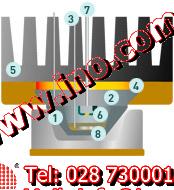 | Principle An aluminum cup (1) with a capacity of 7 ml and containing 2 mL of sample is resting in the sample cup holder. For the test, the sample cup is lifted to the temperature controlled oven (2), forming the test-chamber with a metal to metal seal. A thermocouple (3) is immersed into the sample to measure the temperature. The temperature of the oven is controlled by Peltier elements (4) and an air cooled heat sink (5). The vapor is ignited by a high voltage arc (6) inside the test-chamber. At the flash point, the pressure inside the sealed measuring chamber is increased significantly, which is detected by a built-in pressure transducer (7). A rotating magnet and a small magnet (8) inside the the sample cup provide stirring. |